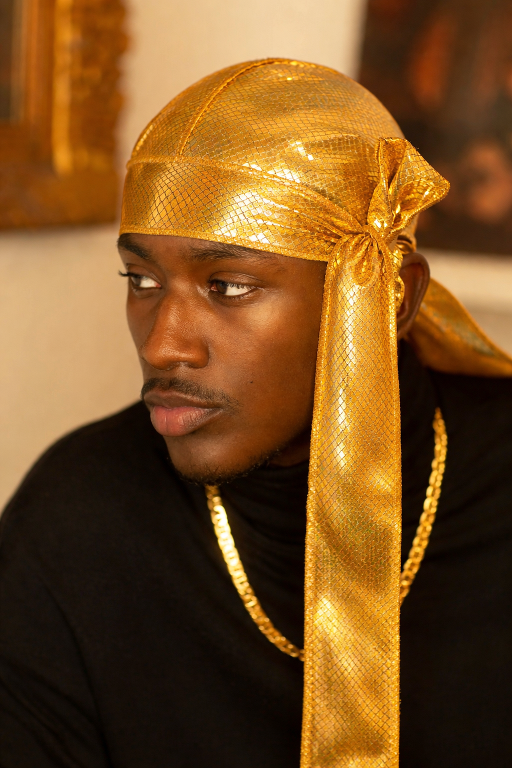 Store › Gold Iridescent Snake skin Durag Image 1 of 2 Image 2 of 2 Gold Iridescent Snake skin Durag $78.00 Velvet, textured Durag. With snake skin iridescent pattern. Add To Cart Added! Velvet, textured Durag. With snake skin iridescent pattern.